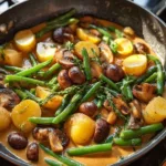 Eine herzhafte Kartoffel-Pilz-Pfanne mit knackigen Bohnen und einer cremigen Sauce, ideal für ein schnelles Abendessen.