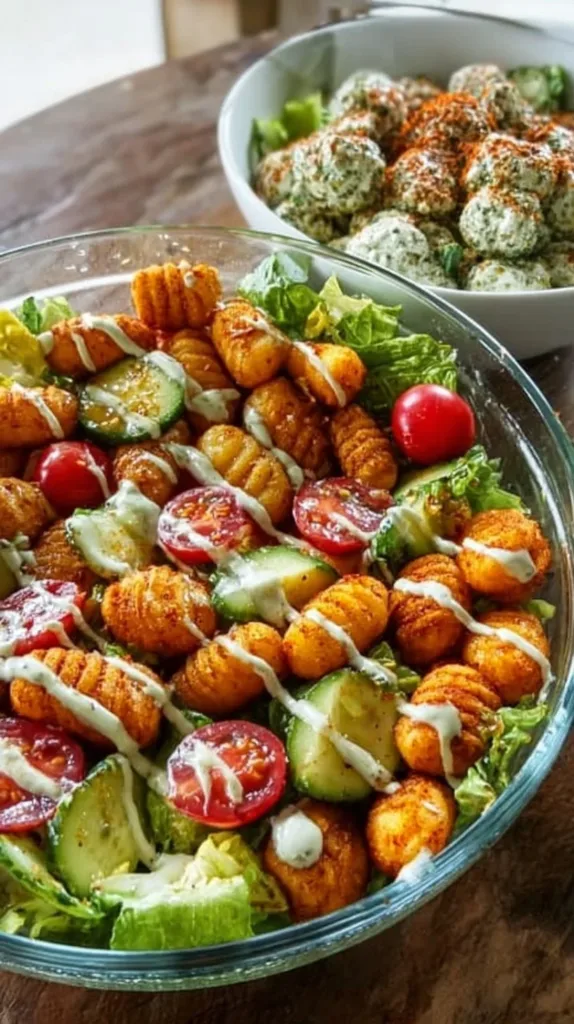 Ein erfrischender Salat, der zarte, knusprige Gnocchi mit einem cremigen Joghurt-Dressing kombiniert - perfekt als leichtes Mittagessen oder besondere Speise.