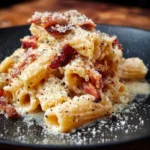 Pasta alla Gricia mit Speck und Pecorino serviert auf einem Teller