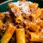 - Mischen Sie die gekochten Rigatoni unter die Sauce und servieren Sie alles heiß, bestreut mit frisch geriebenem Parmesan.