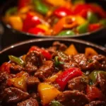 Geben Sie die gewürfelten Paprikaschoten (rot, gelb und grün) in den Topf. Lassen Sie das Gemüse kurz anrösten, damit die Röststoffe das Aroma intensivieren. Mischen Sie Tomatenmark, Curry sowie die Mischung aus edelsüßem und rosenscharfem Paprikapulver unter. Diese Phase verleiht dem Schaschliktopf seine charakteristische Würze und Farbe. Gießen Sie die gehackten Tomaten, Fleischbrühe, Worcestersauce, Honig und Apfelessig hinzu. Rühren Sie gut um. Diese Kombination sorgt für die perfekte Balance zwischen Süße, Säure und Umami. Lassen Sie den Topf bei mittlerer Hitze 45 Minuten bis eine Stunde köcheln. Rühren Sie gelegentlich um und prüfen Sie die Konsistenz. Die Aromen werden sich entfalten, während die Flüssigkeiten reduzieren.